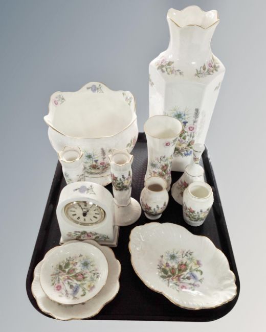 A tray of Aynsley Wild Tudor pattern ceramics including vase, mantel clock, a pair of candlesticks etc.