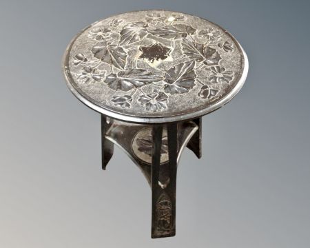An ebonised carved circular Arts and Crafts occasional table