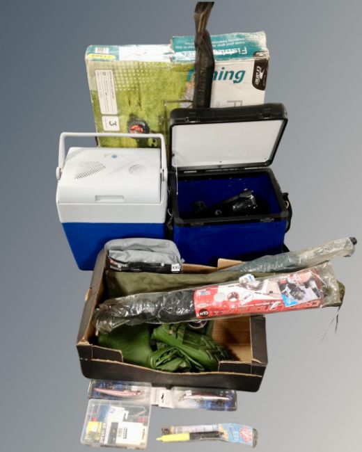 A large collection of fishing equipment including fishing barrow, landing net, waders (size 44/45), 2 plastic storage boxes containing reels etc.