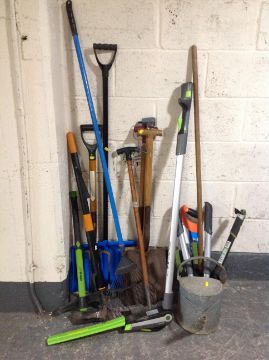 A quantity of garden and hand tools, galvanized watering can, G-tech 18v adjustable hedge trimmer with battery and charger