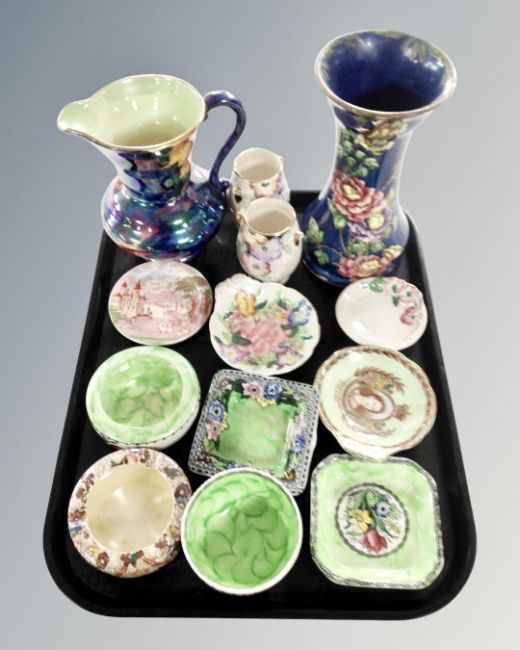 A tray of Maling lustre ware including tall spill vase, coronation dish, storm pattern jug etc.