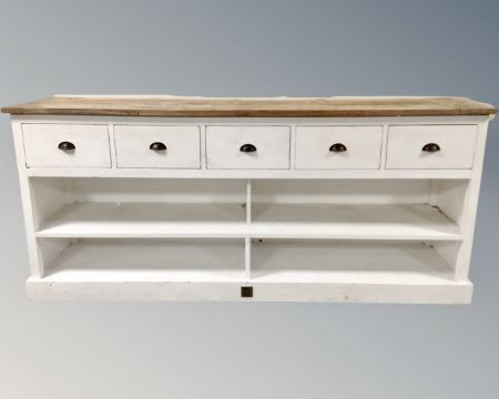 A Riviera Maison farmhouse kitchen unit on painted base fitted with shelves