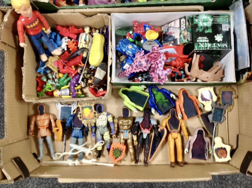 Two boxes of vintage He-man super natural and visionary action figures together with other miscellaneous action figures and toys