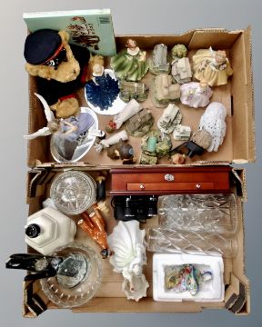 Two boxes containing china ornaments, a Royal Doulton figure of Diana, Beatrix Potter collector's case (empty), crystal vases etc.