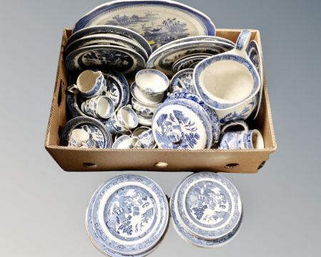 Two boxes of 19th century and later ceramics, large quantity of Willow pattern china, tea ware, pestle and mortar, Chinese dish etc