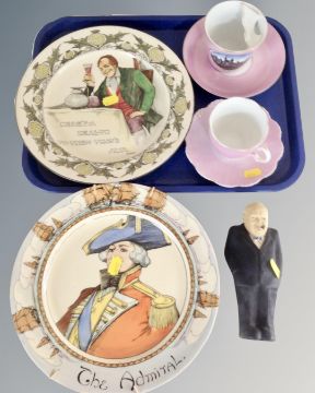 A tray containing two Royal Doulton plates, Robert Burns and The Admiral, together with a figure of Winston Churchill and two German cups and saucers.