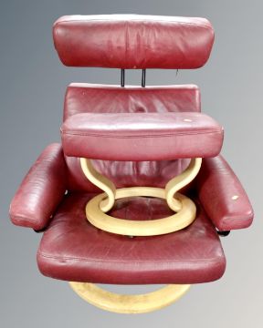 A Stressless Burgundy leather adjustable armchair with matching footstool