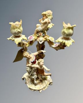 A continental encrusted candelabrum surmounted with figures.