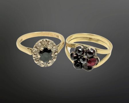 An 18ct gold sapphire and diamond ring and a gold garnet ring (2)