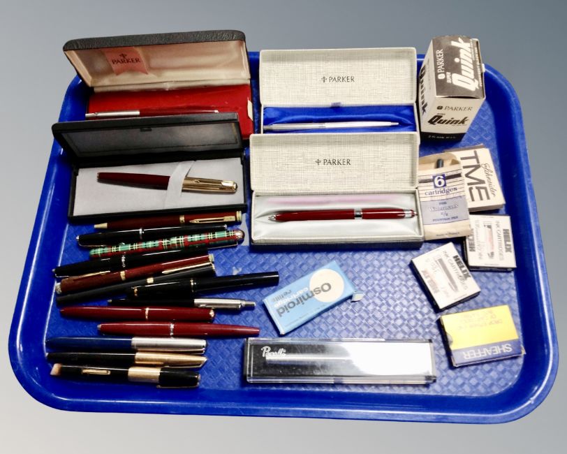 A tray containing a large collection of assorted pens including Parker, together with pen ink cartridges and refills.