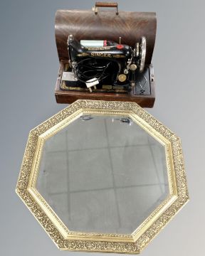 A vintage Singer sewing machine converted to electric, in case, together with an octagonal gilt framed bevelled mirror