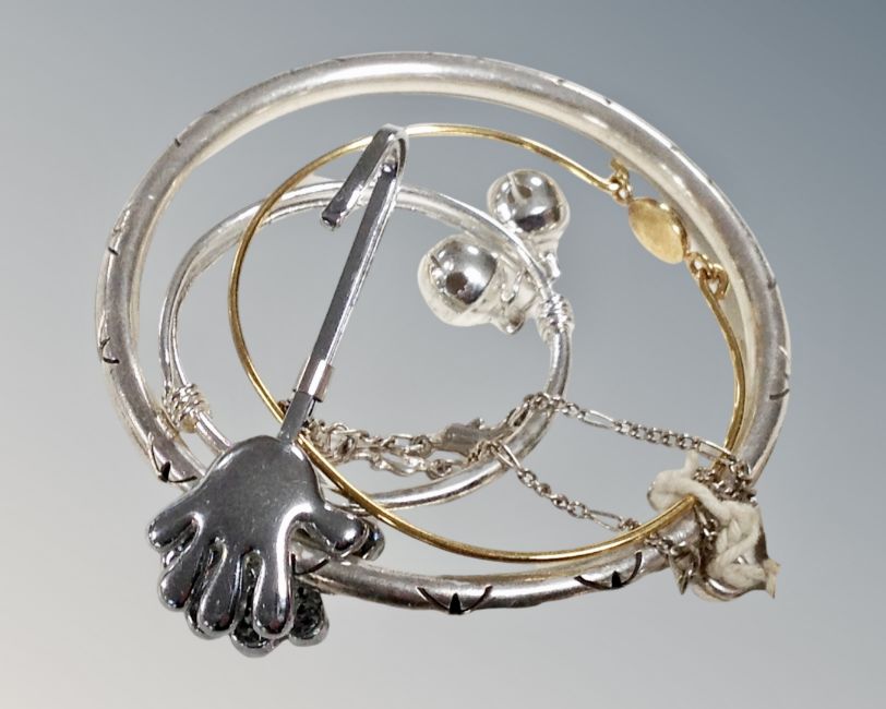 A Mexico 925 silver bangle, a silver dolphin bracelet, a yellow metal bangle with blue stone and a silver bracelet with bells
