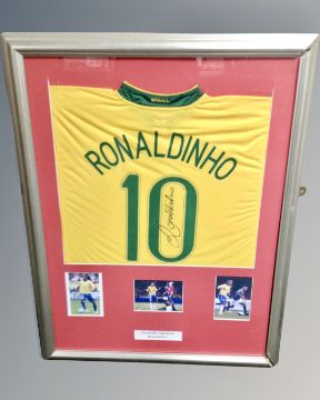 A Ronaldinho signed football shirt in frame with photographic montage, certificate verso.