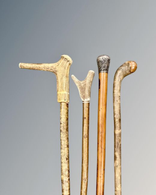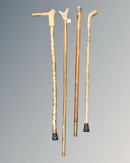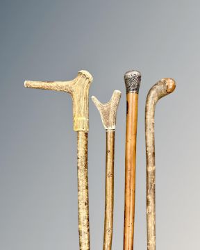 A Victorian walking cane with white metal embossed mount, together with three further walking sticks (4)