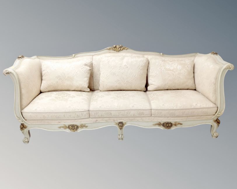 A cream and gilt baroque style three seater settee.