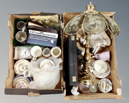 Two boxes of miscellany to include Coalport and continental figurines, cased part-cutlery set, assorted ceramics, glass shades, table lamp with glass shade