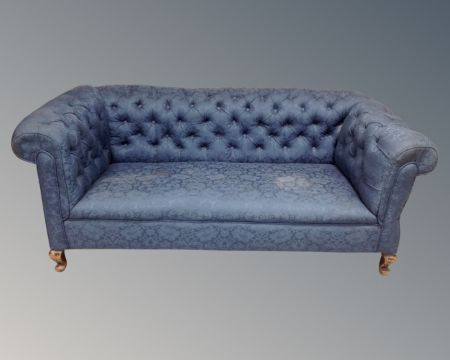 A 19th century Chesterfield drop end settee upholstered in a blue floral fabric.