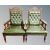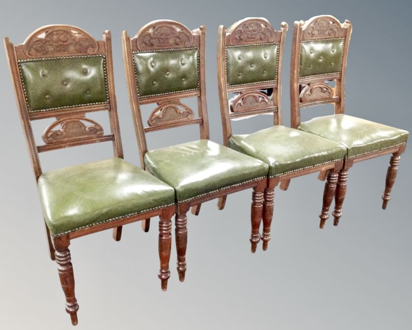 A pair of 19th century carved mahogany open armchairs upholstered in green button leather with a set of four matching dining chairs.