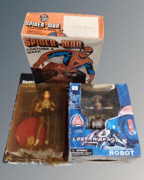 A tray of vintage toys to include Vital Toys Rocky Horror Picture Show figure, Lost in Space battle ravaged robot and a Spider-Man costume and mask, all boxed.