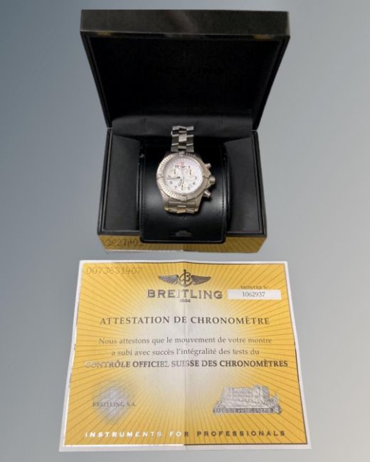 A Gentleman's Breitling Chrono Avenger M1 stainless steel wristwatch chronometer, case 44mm diameter, white dial, yachting function, water-resistant push pieces, decompression valve, Rider-tab bezel, sun compass, 1/100th hour display, quick time-zone change, full stainless steel bracelet, serial number 1062937, with original International warranty card and certificate, operation booklet, three spare links, retail box and outer case.