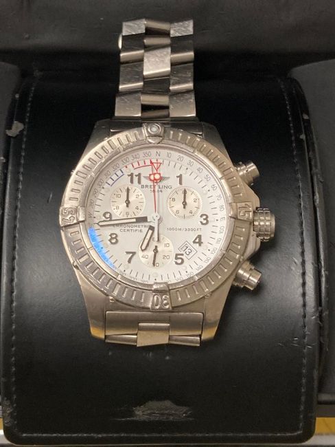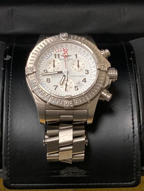 The quartz movement is currently not ticking and will need a new battery. The case and bracelet have all-over light surface scratches, showing obvious use. The glass has some very faint scratches and shallow chips but to the naked eye appears excellent. The dial is also excellent. The chronograph and other functions cannot be tested without a functioning movement, but mechanically they all seem fine. The bracelet clasp is functioning fine. The inner box has some wear and tear but most of the packing is very good.