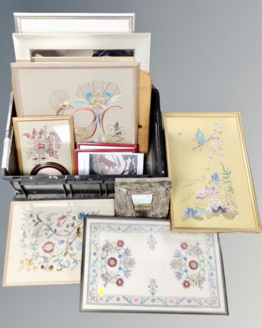A box containing assorted framed mirrors, needlework panels, prints, ornate cherub mirror.