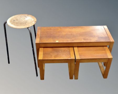 A nest of three 20th century tables together with a 20th century laboratory stool on metal legs.