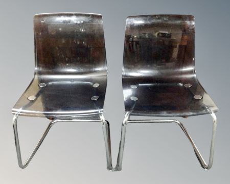 A pair of IKEA Tobias dark clear perspex dining chairs on metal legs.