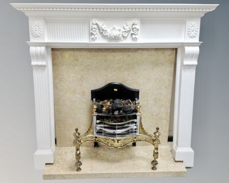 A Victorian style white painted fire surround, marble hearth and back, together with a brass and chrome metal electric fire with coals