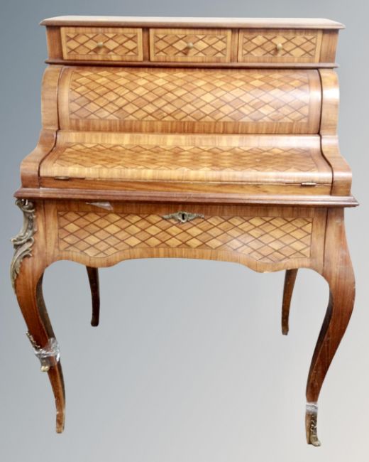A reproduction marquetry Bonheur Du Jour writing desk with gilt metal mounts.