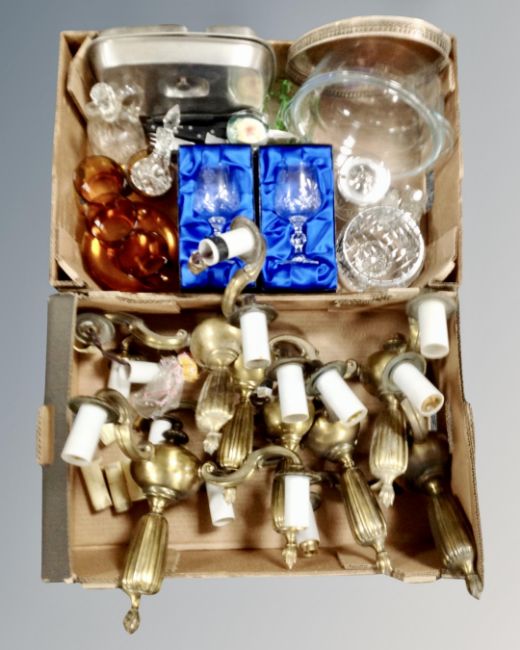 Two boxes of six vintage brass two-way wall lights together with a box of assorted glass wares, stainless steel dishes, steak knives and forks