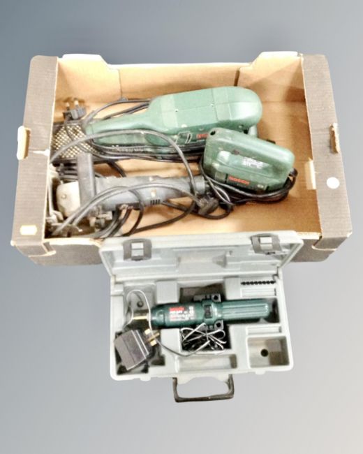 A box of power tools including Bosch sander and jig saw, Bosch electric screwdriver in case, an Elu biscuit jointer.