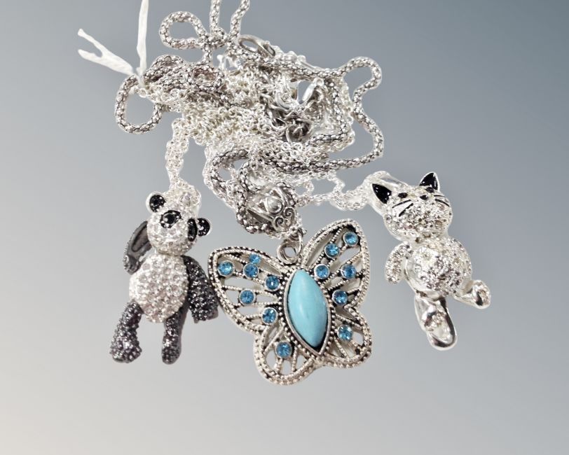 A white metal articulated encrusted cat figure on chain, together with a similar panda and a butterfly with blue sinks.