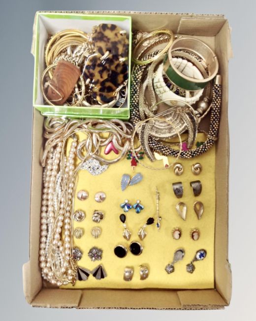 A tray containing a quantity of gold-finished costume jewellery, bangles, beaded necklaces and a quantity of earrings mounted on a cloth.
