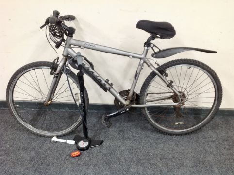 A Ridgeback Bora mountain bike with pump lights and bike locks.