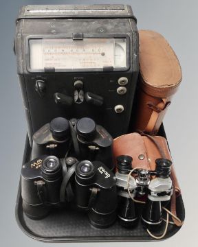A Marconi moisture meter together with three pairs of field glasses including Tohyoh MG star and Solus, two in leather cases.