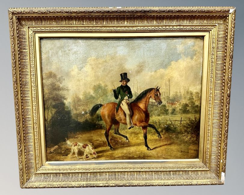 Attributed to William Collins RA (1788-1847) A gentleman on horseback, his dog following, oil on panel, 44cm by 35cm, inscribed verso 'Thomas Huxley Esquire BA, St. Johns Coll. Cambridge, Collins Pinxit', in gilt gesso frame.