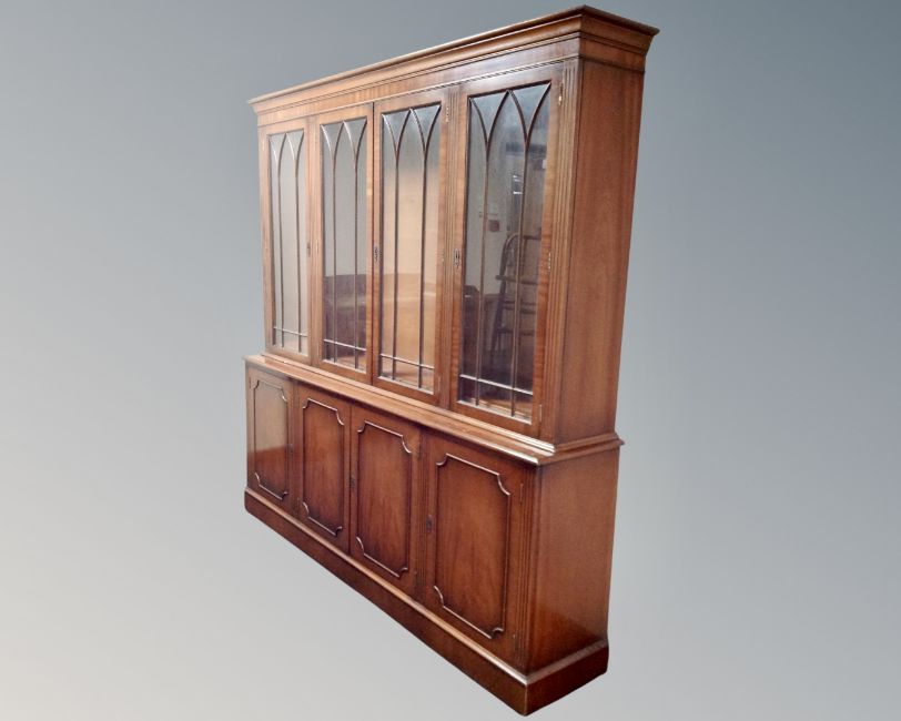 A reproduction mahogany four door glazed bookcase fitted with cupboards below, width 194cm, with matching corner display cabinet.