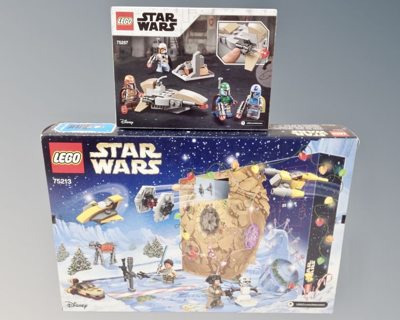 Lego : Tray containing Star Wars 75267 Mandalorian Battle pack, 30006 Clone Walker poly bag, Rey keyring and four issues of Lego Star Wars magazines numbers 65, 69, 89 and 92 all with poly bags, together with 75213 Star Wars advent calendar. CONDITION REPORT: Box may show signs of shelf wear