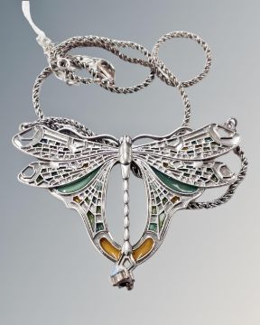 An Art Nouveau white metal plique-à-jour inset dragonfly pendant on unmarked round box chain.