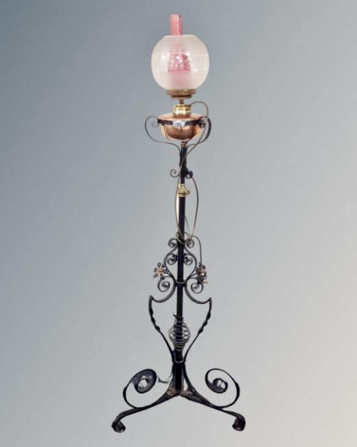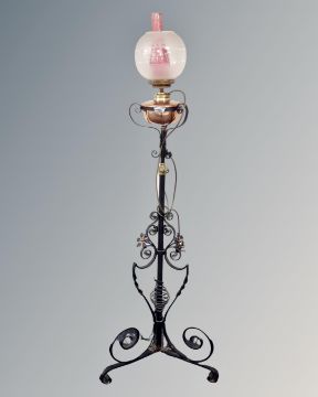 An antique wrought iron rise and fall standard oil lamp with copper reservoir, chimney and shade.