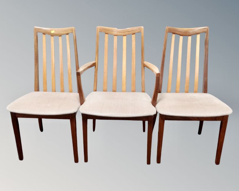 A 20th century oval teak G Plan extending dining table fitted with a leaf, together with a set of six railback chairs, two carvers four singles.