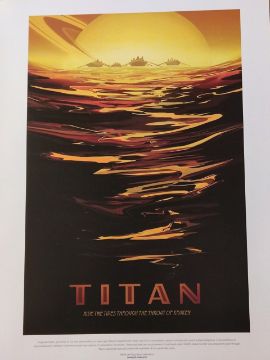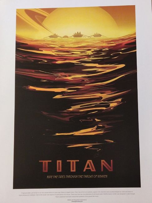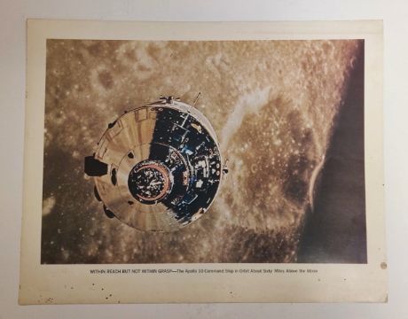 NASA lithographs : Apollo 12 deploying the the Apollo lunar surface experiments package, the Apollo 10 command ship in orbit, Titan space tourist poster and Earth your oasis in space travel poster.