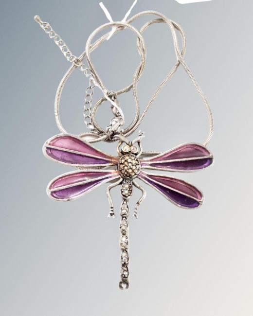 A large white metal plique-à-jour amethyst colour dragonfly brooch.