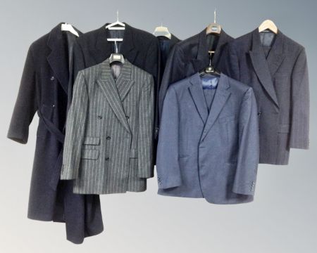 Six assorted gent's jackets and two piece suits together with a wool coat and hat.