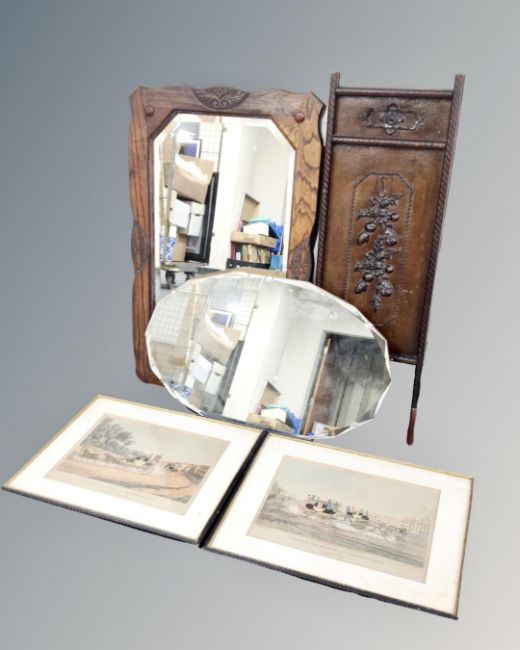 An Edwardian oak framed mirror together with a 20th century frameless bevel edged mirror, two colour prints of coaching scenes and an embossed two way folding fire screen.