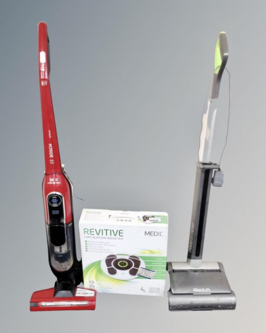 A Revitive circulation booster, boxed, together with a Gtech Airman cordless electric carpet sweeper and a Bosch 18v all floor vacuum.