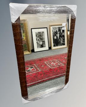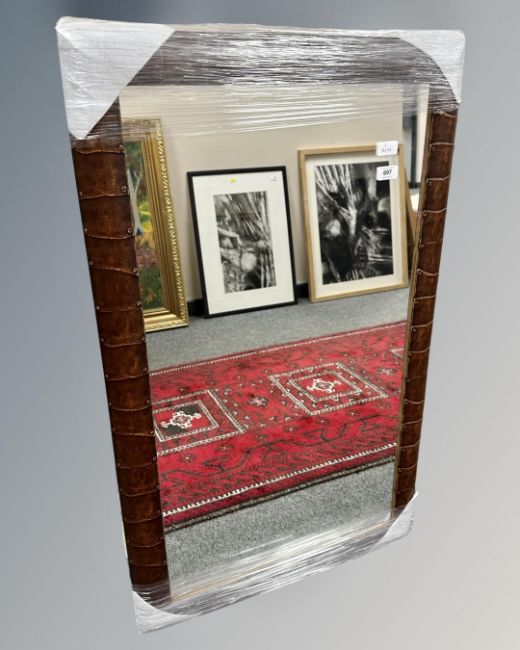 A contemporary mirror in a leather effect frame, 63cm by 103cm.