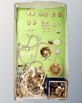 A tray containing a quantity of gilt finish costume jewellery, simulated pearl necklaces and earrings, costume brooches etc.