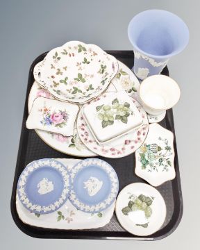 A tray containing assorted ceramics including Wedgwood jasperware, Royal Worcester Mathon lidded dish and trinket dishes, cake plate etc.